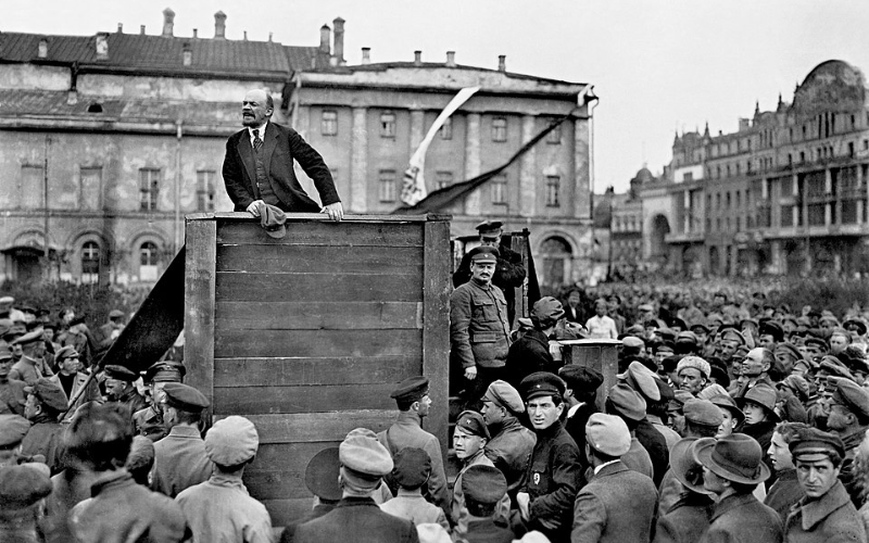 Lenin håller tal i Moskva 5 maj 1920 för att motivera trupperna och befolkningen till den militära insatsen i Polen. Bilden är mest känd för att Stalins regim senare tog bort Trotskij från bilden (han står i uniform bredvid talarstolen); Wikimedia Commons; public domain.