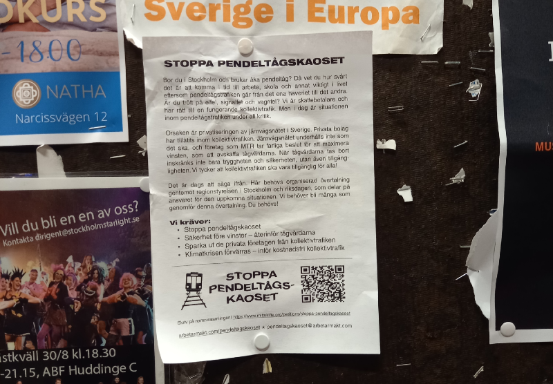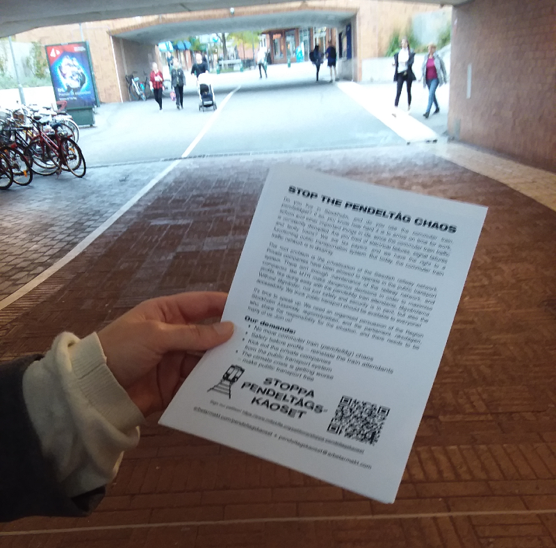 Kampanjen Stoppa pendeltågskaoset fortsätter att väcka intresse och dra in namnunderskrifter till den protestlista vi planerar att överlämna till de ansvariga för kaoset i Region Stockholm. I Huddinge i södra Stockholm har de pendeltågsproblem MTR och Anton Fendert orsakat befolkningen varit särskilt svåra, och där finns också lokal aktivitet och organisering mot problemet. Aktivister från vår kampanj besökte därför pendeltågsstationen i veckan för att dela ut våra flygblad, prata med resenärer och affischera.