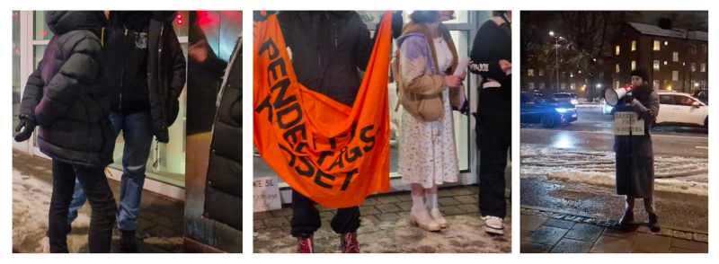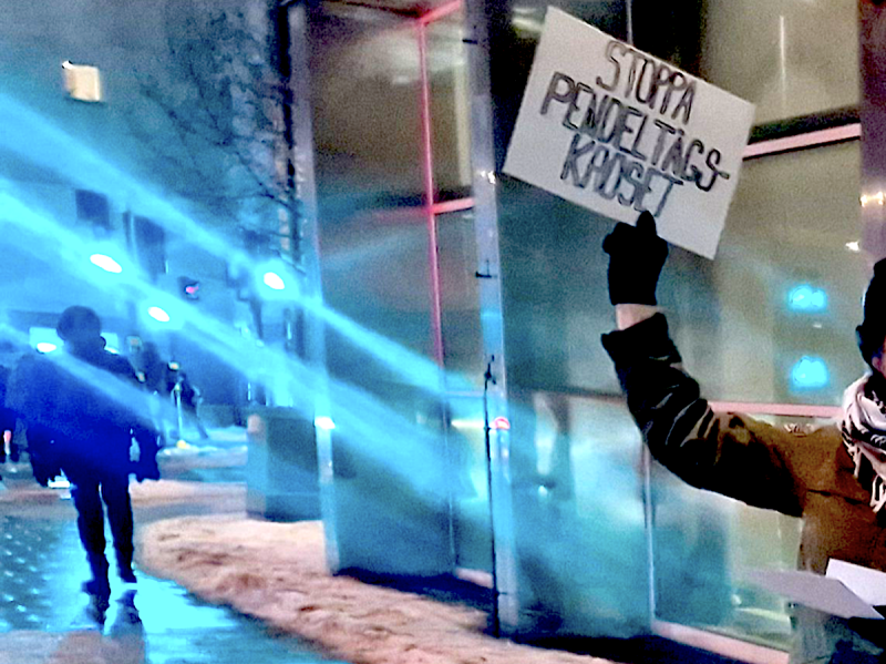 På plats i vinterkylan utanför trafikförvaltningen ställde aktivister upp sig med flygblad, megafon, skyltar och banderollen ”Stoppa pendeltågskaoset”. Bland deltagarna fanns så klart resenärer som besvärats av de förseningar och det kaos som präglat Fenderts kollektivtrafik sedan avskaffandet av tågvärdarna, men också nuvarande och tidigare lokförare och kamrater från andra initiativ inom Pendlarnätverket.