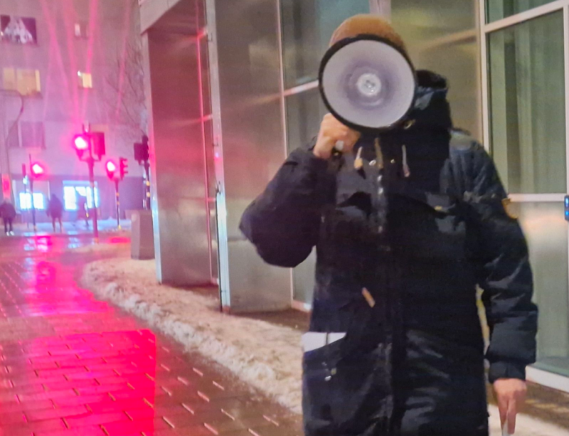 Aktivisterna höll sig varma med talkörer, varav flera hördes även vid Stoppa pendeltågskaosets förra protest utanför trafikförvaltningen, den 21 november: ”Avgå, Anton Fendert”, ”Likvärdighet, tillgänglighet – arbetarklassens kampenhet”, ”Svikare och sossepamp: vi är resenärer i enad kamp – vi vill ha tågvärd, vi vill ha ramp”, ”Lyssna på lokförarna! Återinför tågvärdarna”.