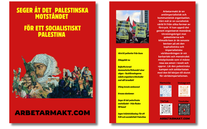 Vi har tagit fram ett nytt flygblad om Palestina med rubrikerna Seger åt det palestinska motståndet och För ett socialistiskt Palestina. Vi kommer att dela ut det på demonstrationer till stöd för palestinierna och vid andra tillfällen. Syftet är att popularisera och sprida idén om att också stödja palestinierna i egenskap av att vara en kämpande kraft som slår tillbaka mot imperialismen och bosättarkolonialismen – istället för att bara stödja dem som offer.