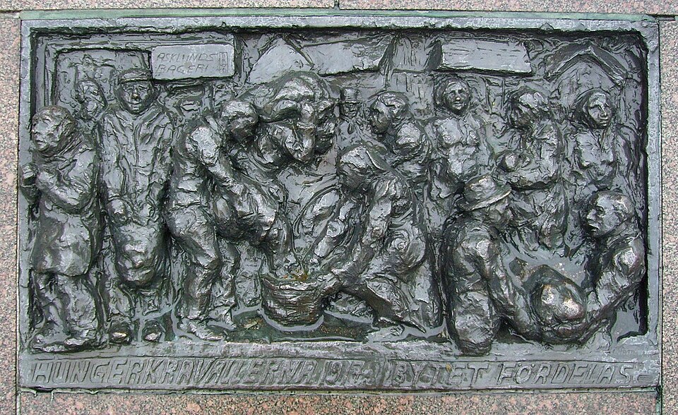 ”Hungerkravallerna 1917. Bytet fördelas”, minnesmonument på Järntorget i Göteborg över arbetarnas uppror i Göteborg 1917 mot svälten som då rådde; Wikimedia Commons; public domain